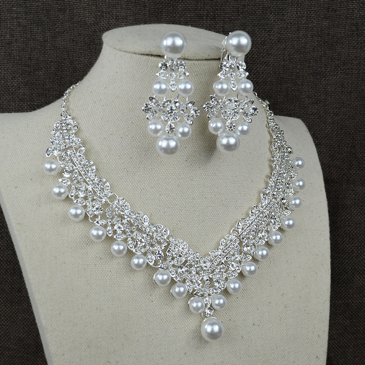 White pearl necklace diamond suit bride wedding accessories hair earrings set 0284 quantity